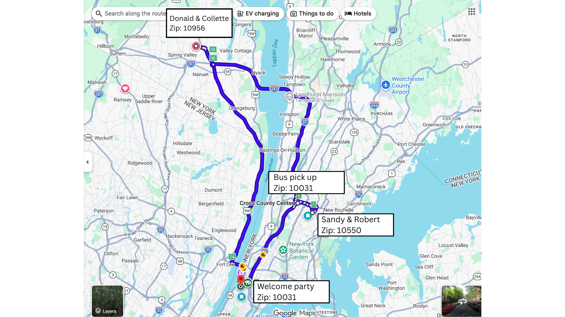 We recommend reserving a hotel (linked below) or airbnb in Rockland county near Donald and Collette OR Westchester county near Sandy and Robert.